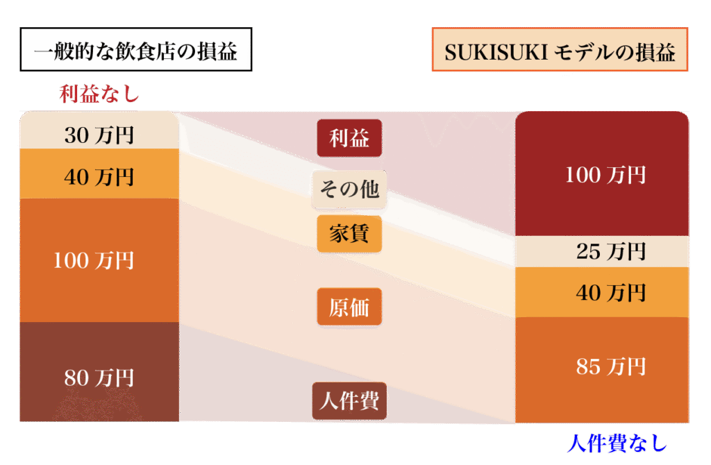 同じ売上でも、弊社のSUKISUKIと一般的な飲食店では月間利益が 100万円 も違います!